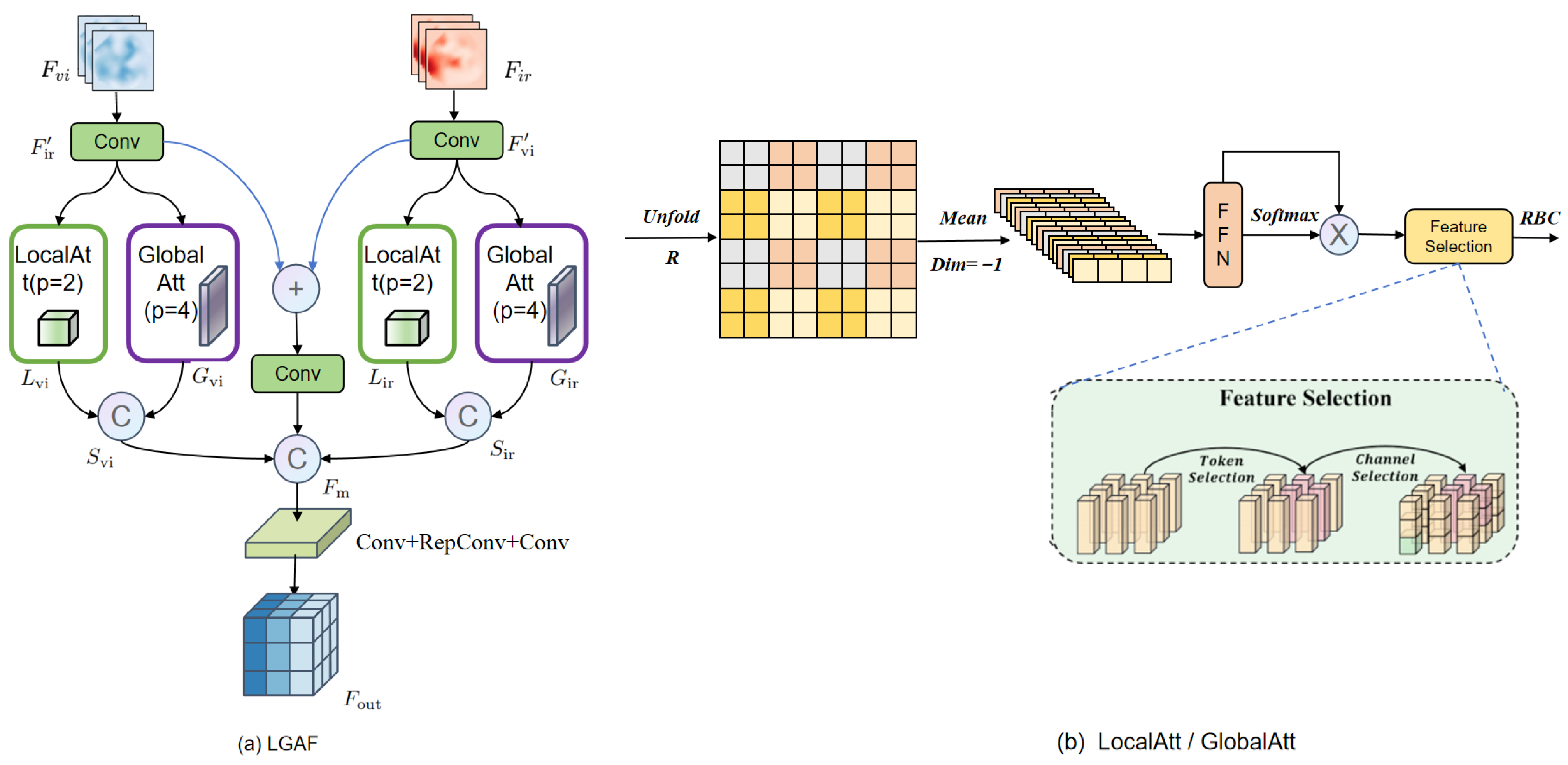 In RGB–IR image fusion, the features from the two modalities differ significantly, and their representations in feature space are often strongly misaligned due to discrepancies in imaging mechanisms and semantic distributions. As a result, it is difficult for fusion models to strike a balance between preserving fine details and enhancing target saliency. Moreover, in CNN-based fusion methods, the receptive field of convolution operations is inherently limited, making it hard to capture long-range contextual dependencies. Purely global attention, on the other hand, tends to overlook local structural details, and thus cannot simultaneously preserve local cues and global semantics. In addition, during multimodal feature fusion, features at different scales are often insufficiently coupled along the spatial and channel dimensions, which leads to low fusion efficiency. Most existing methods also rely on fixed weights or simple concatenation, and therefore cannot dynamically adjust the importance of each modality according to local content, making them prone to noise and redundant information. Furthermore, many existing local–global or dual-path attention mechanisms either apply local and global attention sequentially or share a single attention map across modalities, which limits their ability to decouple local and global modeling from cross-modal fusion and to provide a stable modality-agnostic reference path.