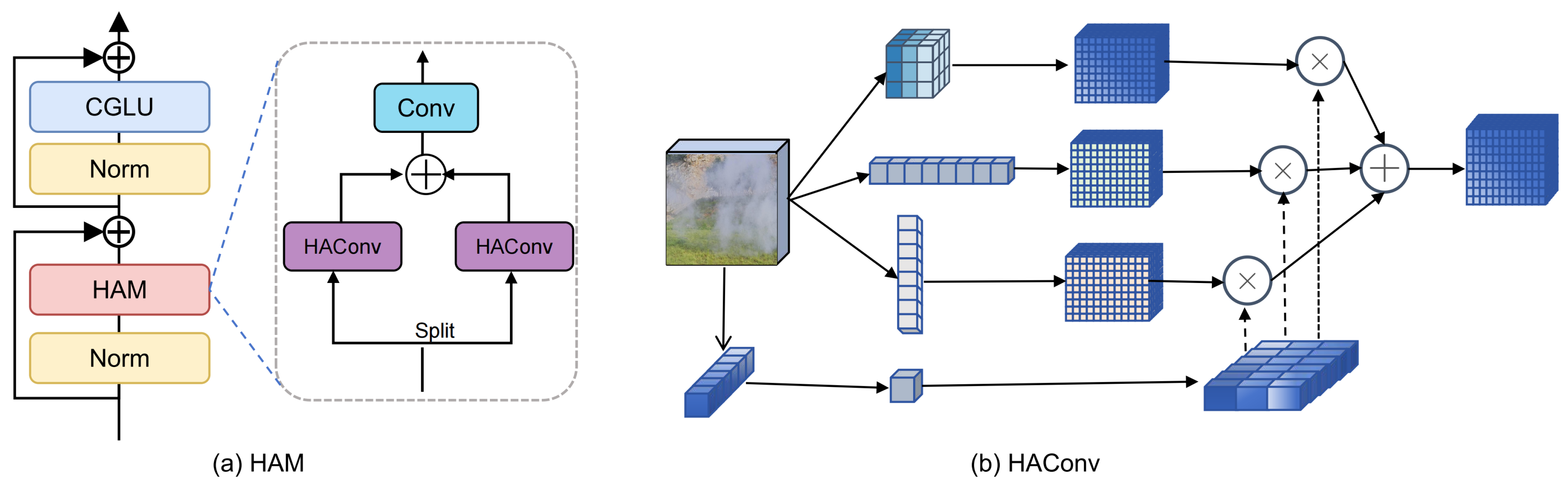 Figure 4a, HAM consists of a normalization layer, a context-gated linear unit (CGLU), and a core hierarchical adaptive convolution (HAConv) unit. Residual connections and hierarchical feature fusion are employed inside the module so that high-level semantic context can be injected while preserving low-level structural information, leading to robust cross-layer feature representations.