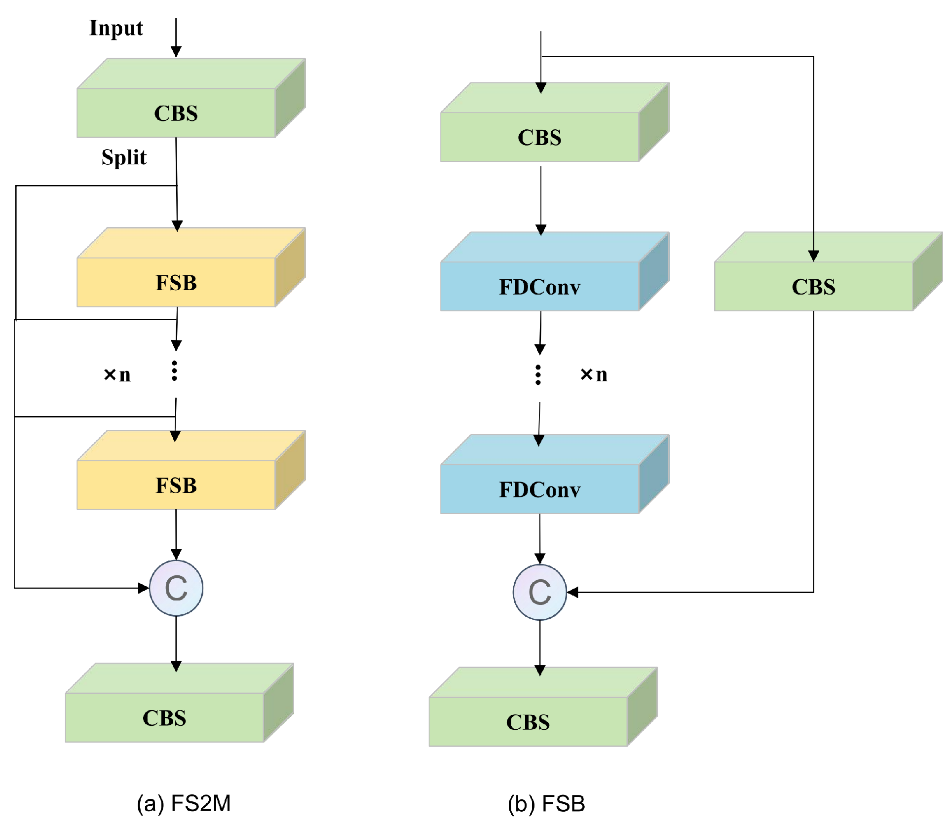 Figure 5a. The input feature first passes through a standard CBS block for initial feature extraction and normalization. Then, a channel-wise split operation divides the feature into several parallel subchannels, each of which is fed into multiple stacked FSB units for deep feature transformation. Inside each FSB, a core FDConv [