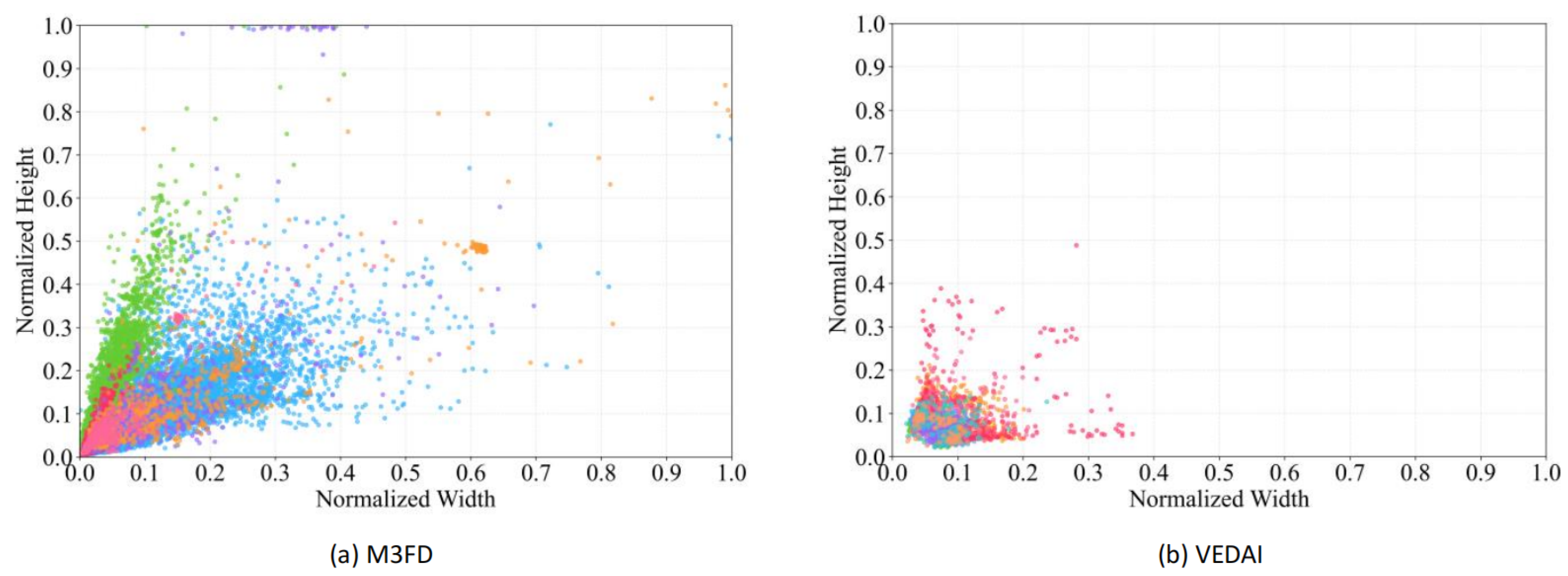 FD, the scatter points span a wide range, covering targets from extremely small to medium and large scales, with a clear long-tail pattern and multiple clustered groups. This indicates stronger scale diversity and larger intra-class scale variance. In contrast, the scatter distribution of VEDAI is highly concentrated in the small-scale region, and the color distribution is dominated by a few categories, revealing significant class imbalance. These factors pose substantial challenges for robust object detection.