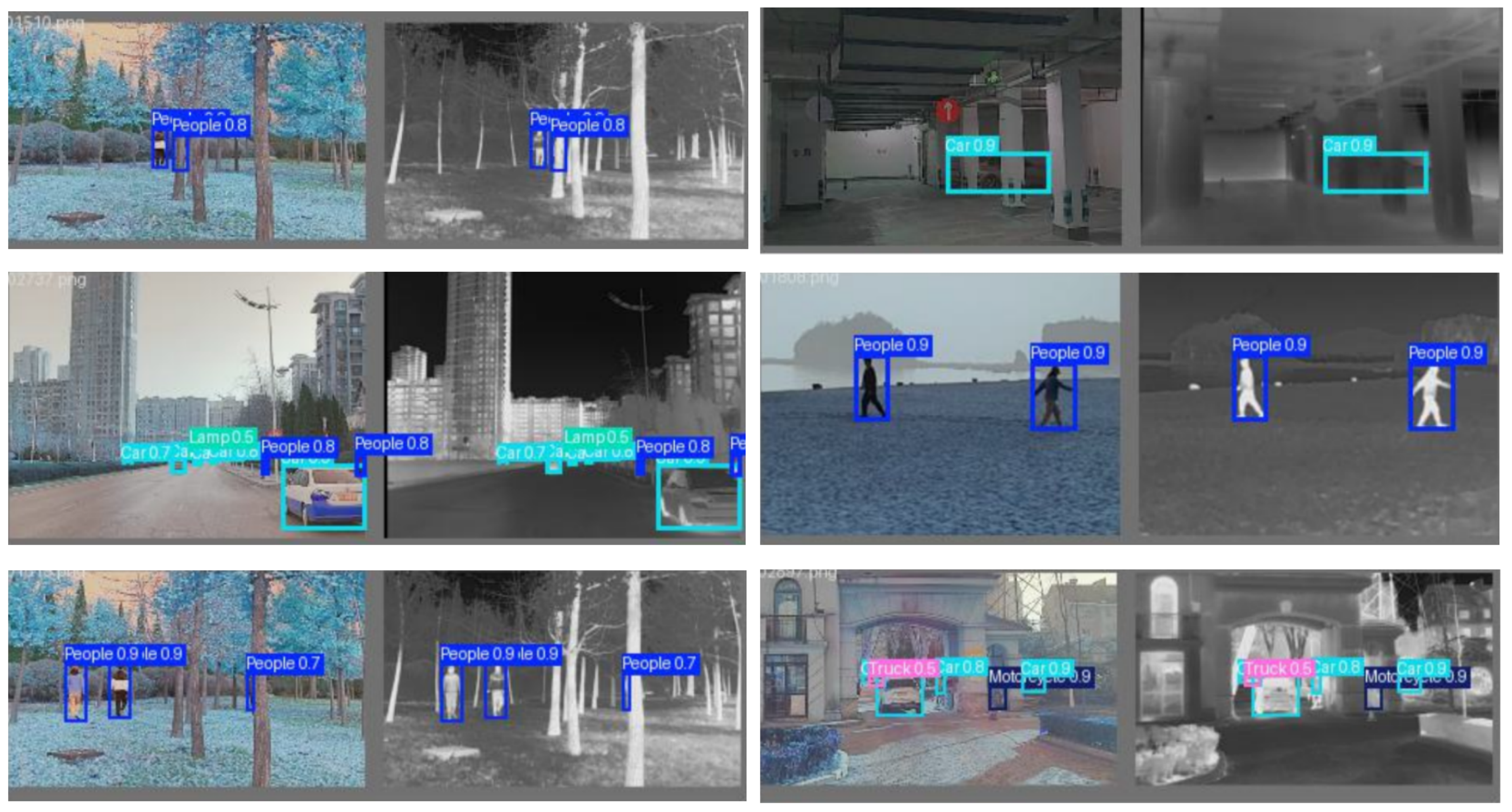 FD dataset, where the left column in each group is the RGB image and the right column is the IR image. As can be seen, the proposed method can stably localize different categories of targets in both modalities, and maintains high confidence scores, mostly in the range 0.7–0.9, even under low illumination and strong backlight conditions, effectively suppressing background clutter such as reflections, foliage textures, and building structures. The detector is also able to clearly delineate distant pedestrians and small and long-range targets, demonstrating strong robustness to small and long-range targets.