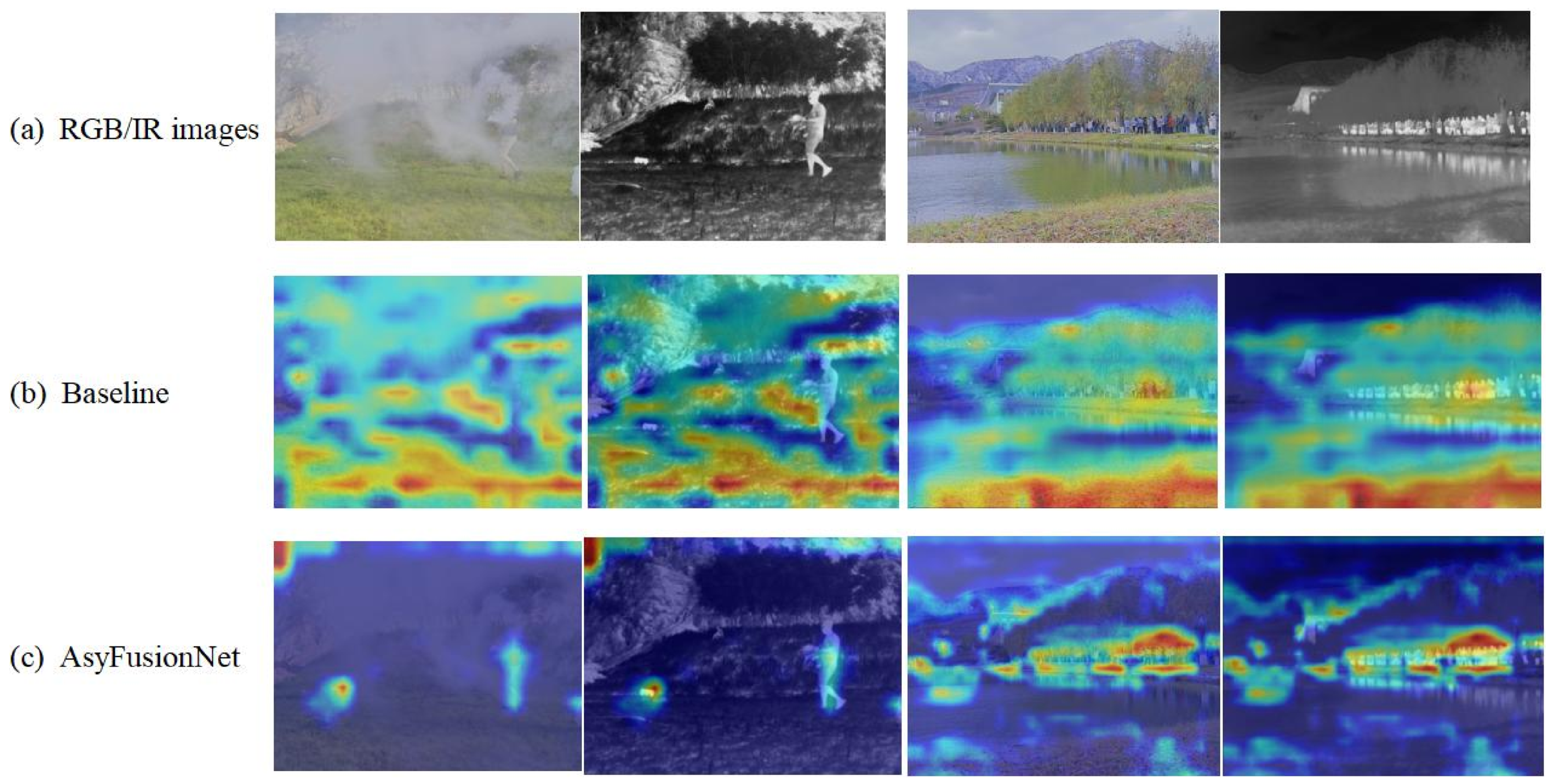 In contrast, AsyFusionNet exhibits clearly superior behavior, with its attention distribution being much more accurate and targeted. Benefiting from the proposed asymmetric fusion architecture, our method can adaptively integrate the complementary cues from RGB and IR modalities to form more robust feature representations. Under the same test scenarios, the heatmaps produced by AsyFusionNet show well-defined target contours and precise boundary localization, while spurious activations in background regions are effectively suppressed. Notably, in the first human detection example, the proposed method accurately outlines the entire human body and remains sensitive to fine details. In the challenging water surface scene, AsyFusionNet, through its cross-modal attention design, successfully overcomes the interference of reflections and complex background textures, achieving precise localization of the true target regions.