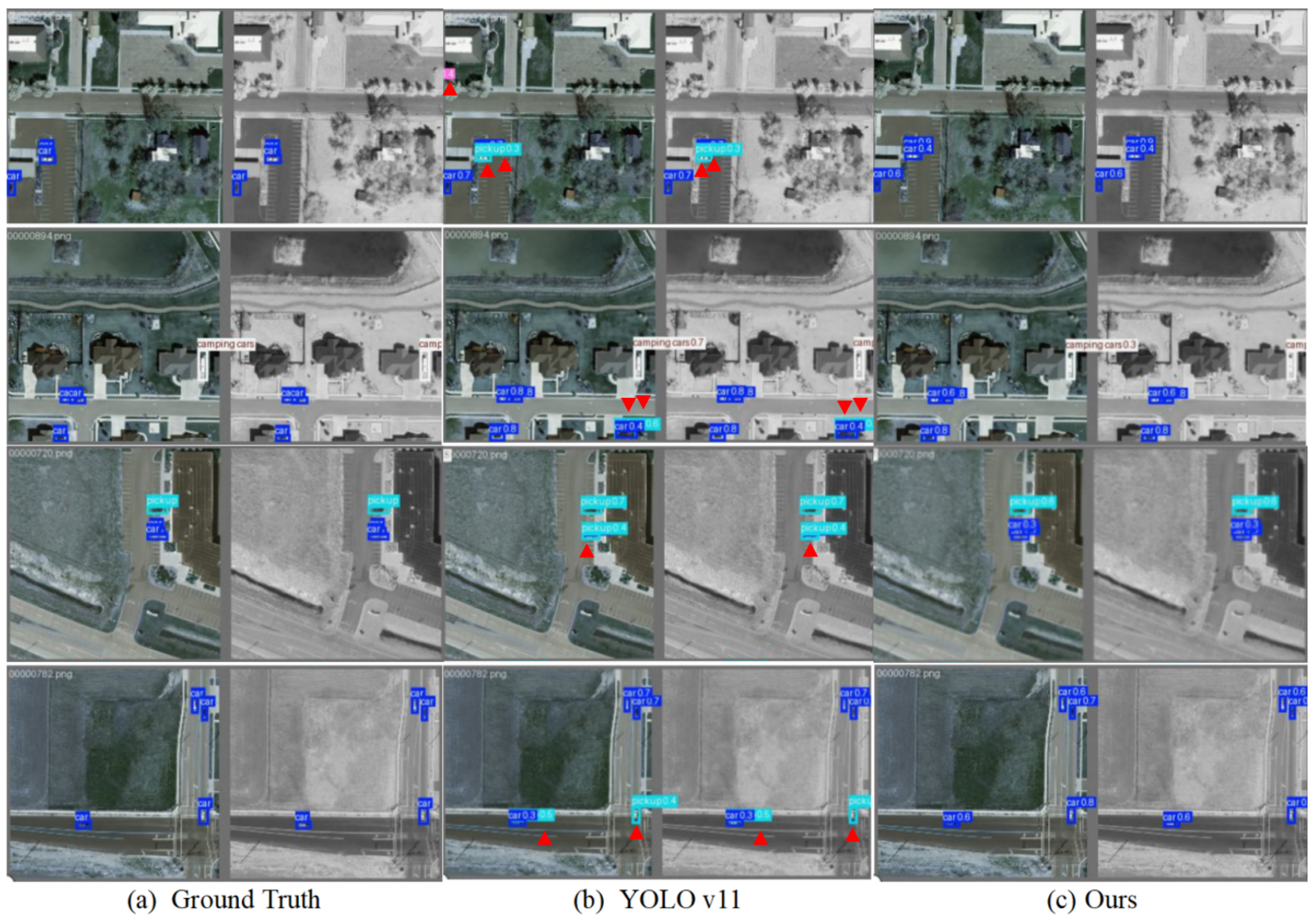 Figure 9, YOLOv11 produces multiple false alarms caused by high-intensity ground textures, road markings, and roof reflections, marked by red triangles. It also suffers from missed detections and inaccurate localization under partial occlusion and low-contrast backgrounds, for example with bounding boxes that extend beyond the true object extent and category confusions where cars are misclassified as pickup or camping vehicles. In contrast, the proposed method suppresses background clutter more reliably and recovers small targets more faithfully. In both parking lot scenes and long-range road scenes, it can still produce accurate bounding boxes with high confidence scores for vehicles that are small in size or partially covered by shadows, and the category predictions are more consistent. In addition, the bounding boxes generated by our method adhere more tightly to the minimum enclosing rectangles of vehicles, reflecting higher localization accuracy and robustness.