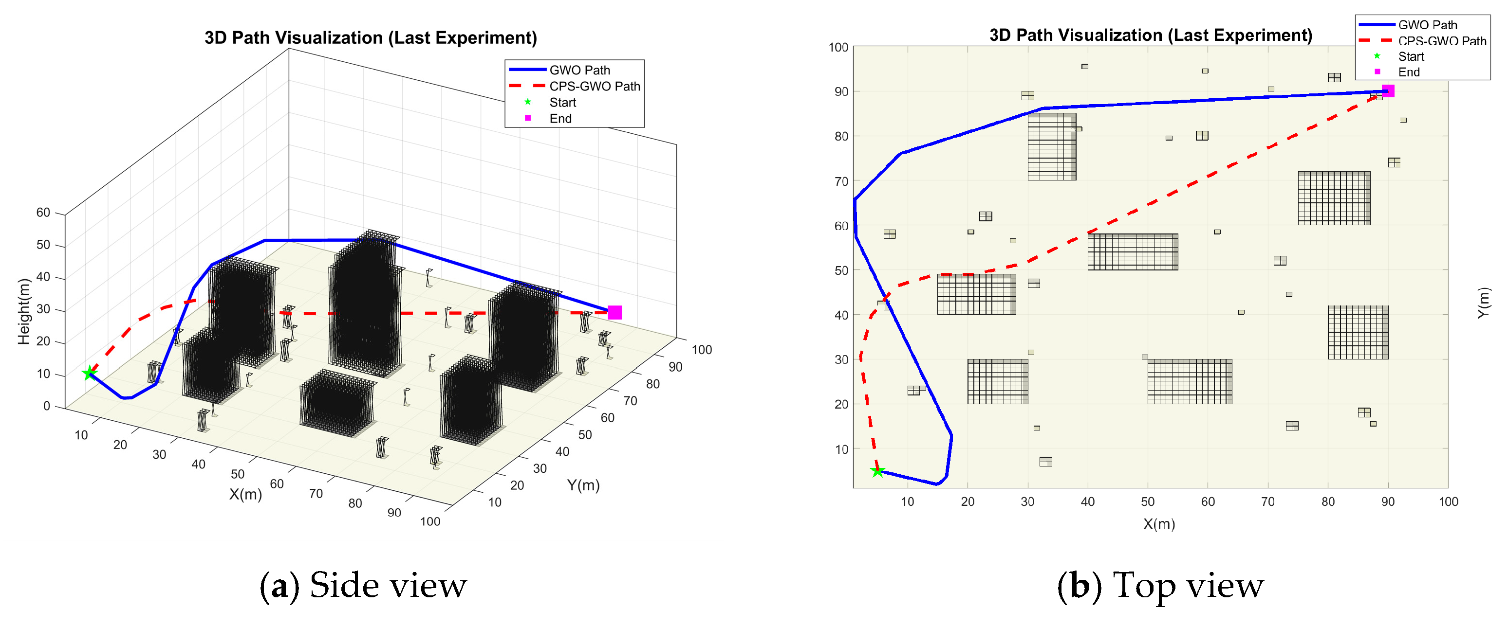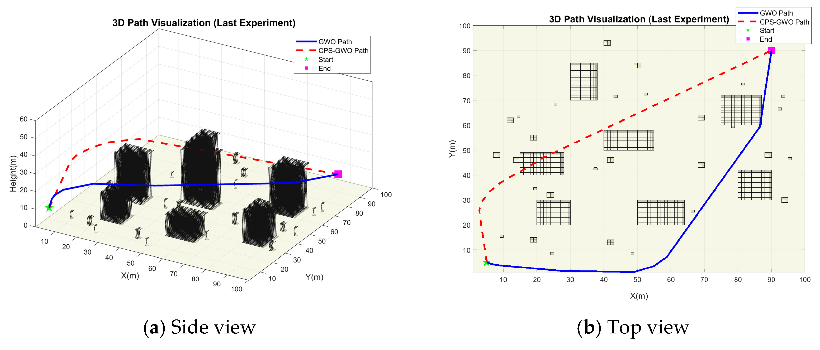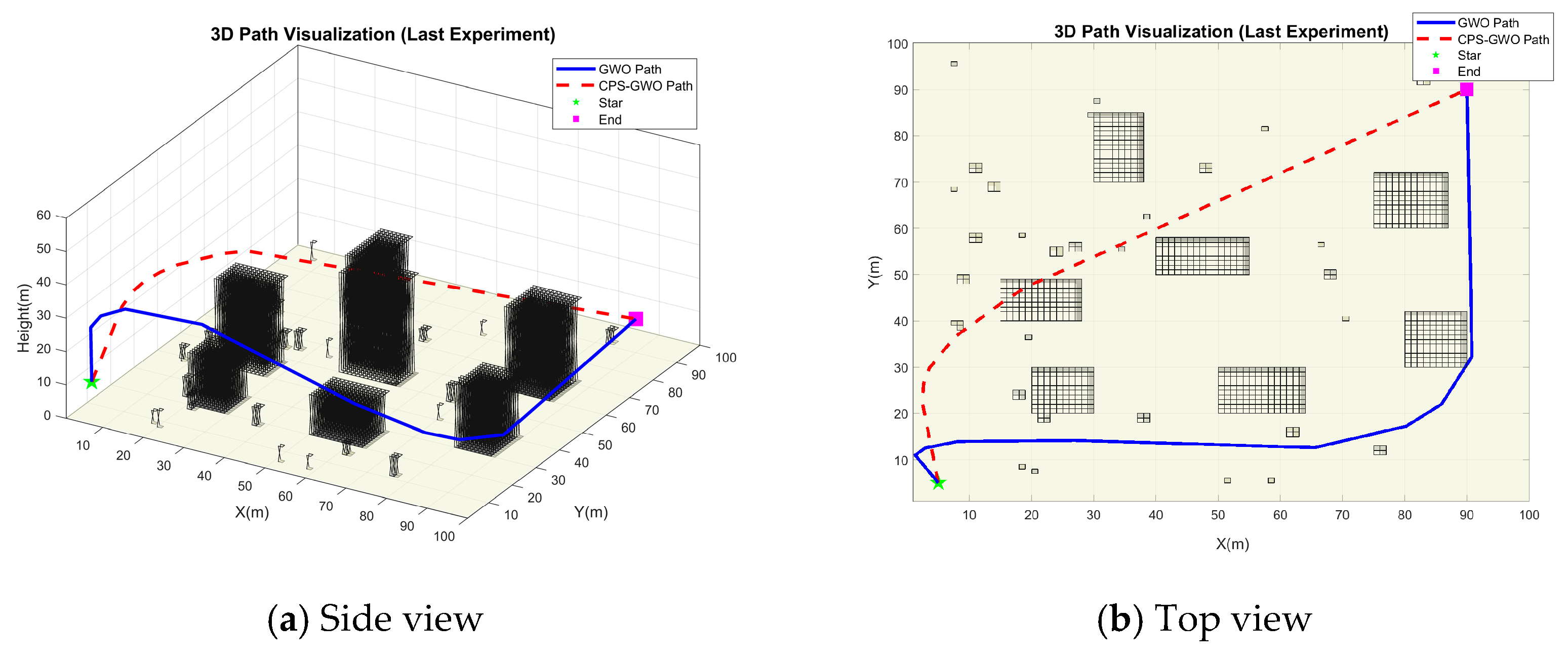 In terms of computational time, the average computation time for both algorithms increases approximately linearly with population size, consistent with the N × T × D time complexity. Under identical settings, CPS-GWO’s runtime is approximately 2.7 times that of standard GWO, attributable to the additional computations introduced by the Kent chaotic map, nonlinear convergence control, and PSO-inspired update mechanism. However, this additional computational cost is offset by a significant improvement in optimization quality: when the population size is 100 and 200, the average fitness values of CPS-GWO decrease by approximately 35.1% and 26.8%, respectively. CPS-GWO generates shorter and more stable paths at the cost of a moderate yet acceptable increase in computational time.