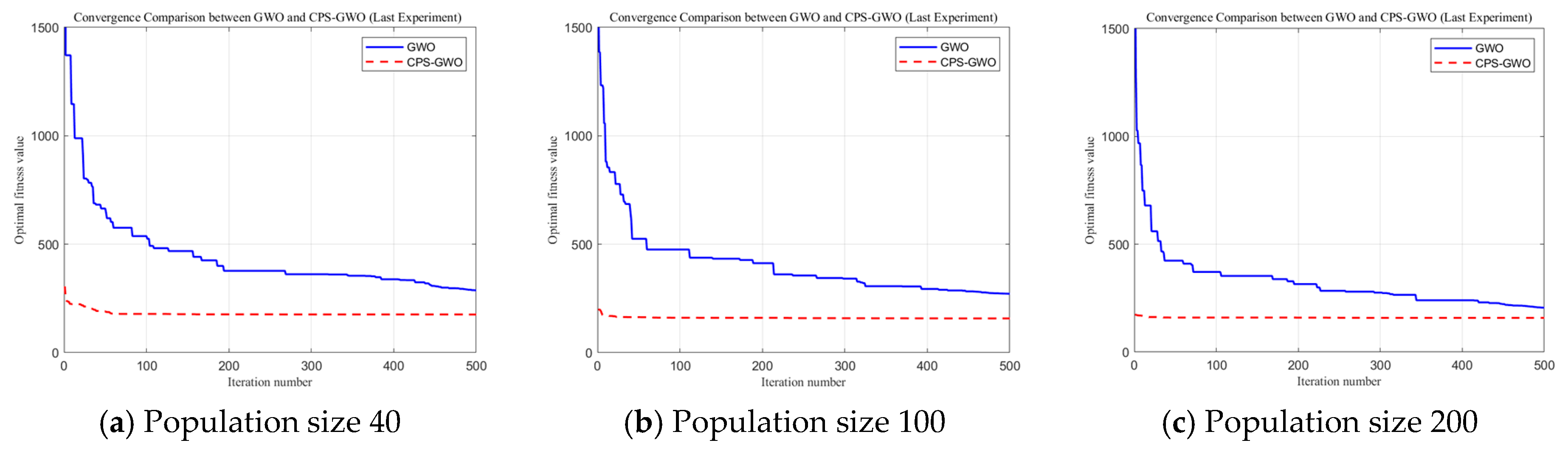 In terms of average fitness value, the CPS-GWO demonstrates superior global search performance under the same population size. It can be seen from the data in the table that in the small-scale experiment, the average optimal fitness value of the CPS-GWO is 159.78, representing a 38.53% reduction compared with the standard GWO; in the medium-scale experiment, the average optimal fitness value of the CPS-GWO further decreases to 150.45, a further 31.30% reduction compared with the latter. This result indicates that by introducing the Kent chaotic map in the population initialization stage and superimposing the chaotic disturbance mechanism during the iteration process, the CPS-GWO effectively improves the spatial distribution uniformity of the population, reduces the search blind spots caused by random initialization, thereby enhancing the algorithm’s ability to jump out of local optimality and significantly improving the overall convergence accuracy.