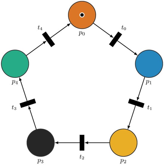 A marking specifies the distribution of tokens across all places. A transition is enabled when each of its input places contains at least one token. Once enabled, the transition may fire, removing a token from each input place and adding one to each output place. A marking is said to be reachable from another if it can be obtained through a sequence of transition firings. A Petri net is live if, from any reachable marking, it is always possible to eventually fire every transition, either directly or after a sequence of other firings. It is safe if, in all reachable markings, no place ever contains more than one token. A simple Petri net example is shown in Figure 1. The net consists of five places (–) arranged in a regular pentagon, each one coloured according to the Okabe–Ito palette (vermillion, blue, orange, black, and green). Five transitions (–) connect the places cyclically, and a single token is initially placed in . This means that the first active colour in the sequence will be vermillion.