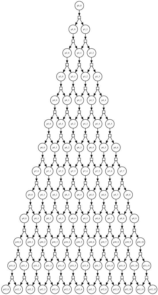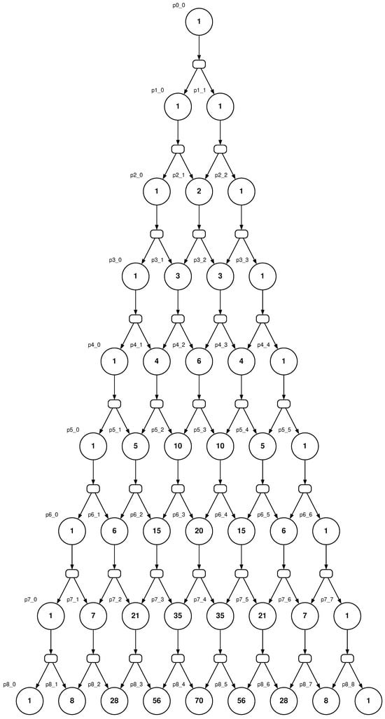 Hence, the Petri net does not merely suggest but exactly computes Pascal’s triangle through its marking evolution. An illustrative example is shown in Figure 3.