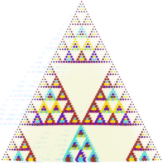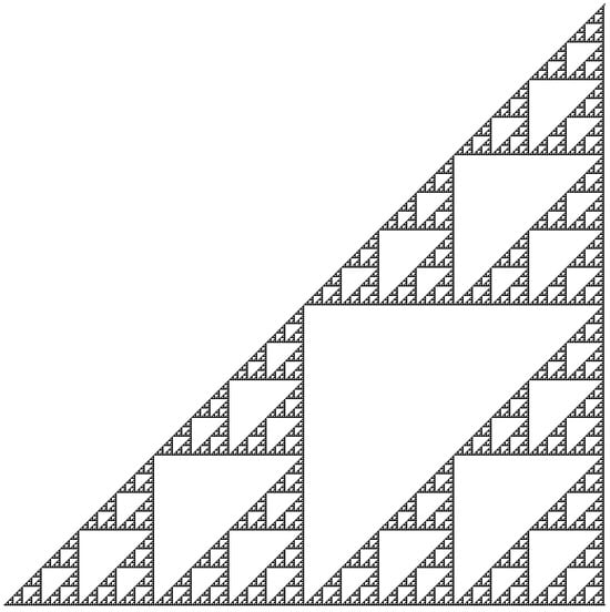 Pascal’s triangle, one of the most fundamental structures in mathematics, has fascinated scholars for centuries. The triangle is often one of the first mathematical objects through which young scholars discover the connections between algebra and combinatorics, for instance, in the expansion of and . First studied in ancient China and later formalised by Blaise Pascal [1], the triangle provides a simple, yet powerful organization of binomial coefficients [2]. Beyond its elegance, Pascal’s triangle is deeply connected to numerous mathematical areas, including combinatorics [3], algebra [4], probability theory [5], and number theory [6]. Its visual and recursive nature also makes it a natural candidate for computational modelling [7]. An interesting structure closely tied to Pascal’s triangle is the Sierpiński triangle, one of the most famous fractal shapes that intrigues mathematicians [8,9,10,11]. In contemporary contexts, it has also found applications in other domains, such as computer science, for example, in the design of data centre architectures for cloud computing [12] or in the development of fractal-based authentication techniques [13].