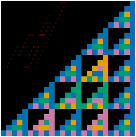 Following the obtained results presented before, including the binary case (modulo 2), richer structures can also be generated by applying a different modulo to the number of tokens. For example, choosing generates a highly regular fractal decomposition of the rectangular display. The computation follows the same principle as in the binary case, but with the well-known Okabe–Ito coloured palette [47] replacing the black and white scheme presented in the previous section. The rules can be specified as follows: