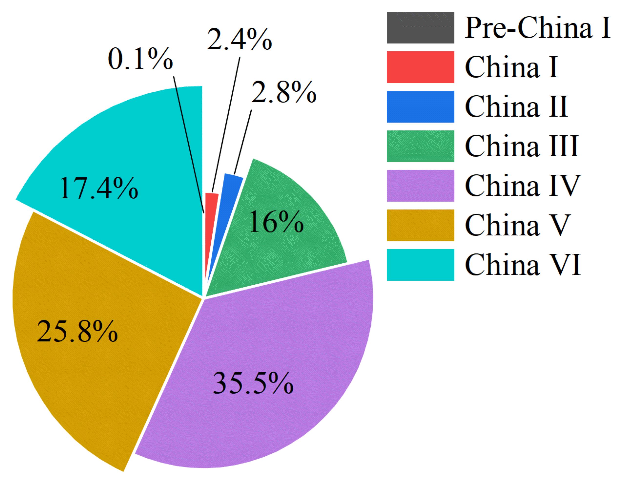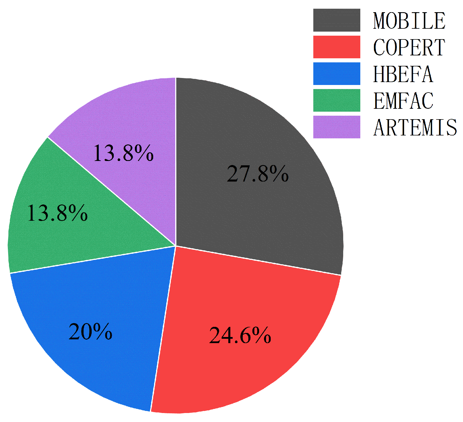 9]. According to literature statistics, five models—MOBILE, COPERT, HBEFA, EMFAC, and ARTEMIS—are most frequently applied in current research, as illustrated in