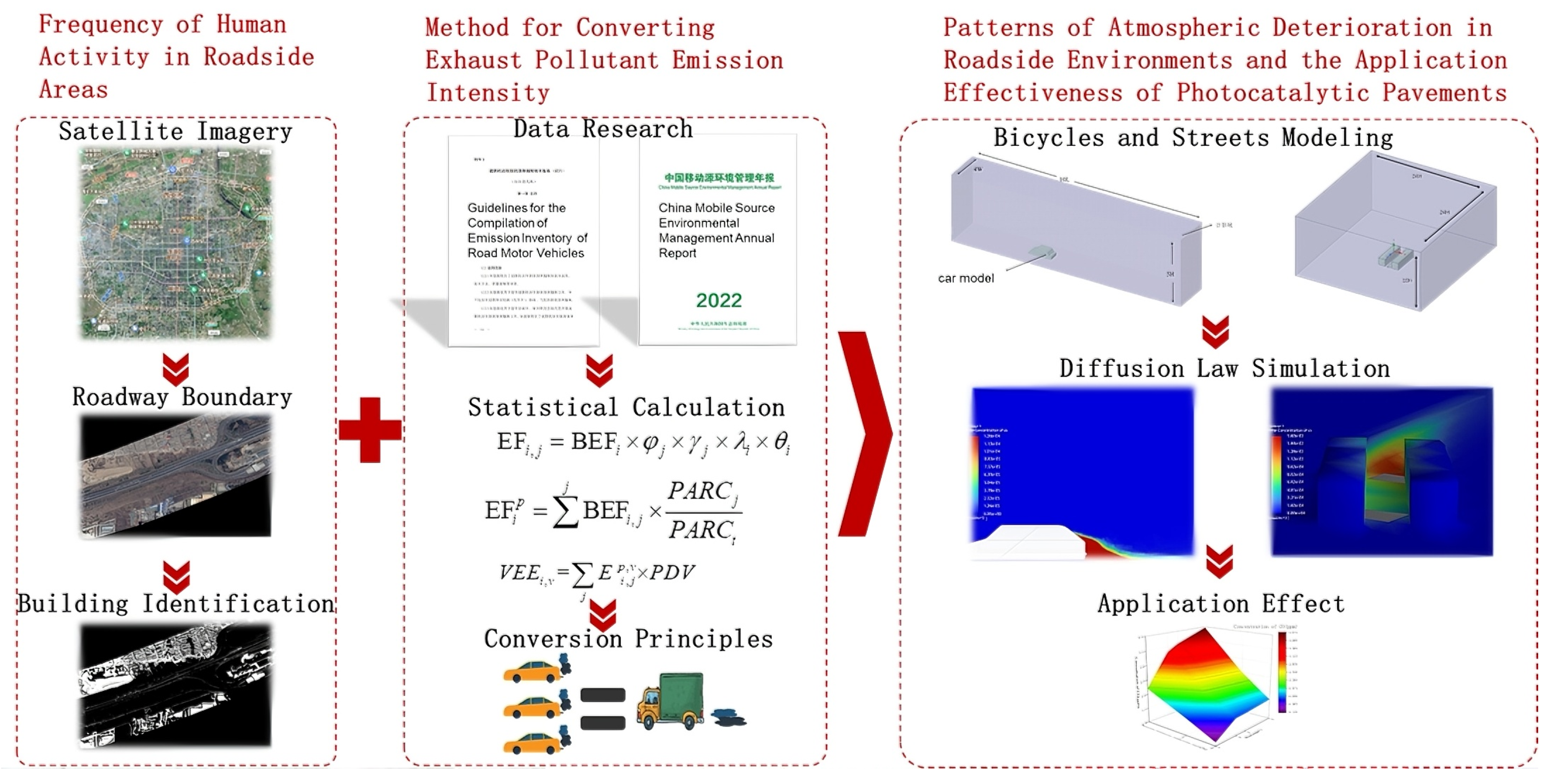 This study seeks to address this gap by examining atmospheric deterioration in road environments through an integrated framework that accounts for the adverse health implications of exhaust constituents, the multiscale dynamics of pollutant dispersion, and the functional efficacy of photocatalytic pavement materials. The primary contributions are threefold: (1) proposing an equivalent-pollution vehicle conversion method based on human toxicity potential; (2) analyzing exhaust diffusion patterns from both individual vehicles and street canyons using CFD; and (3) evaluating the effectiveness of photocatalytic pavement for exhaust mitigation”.