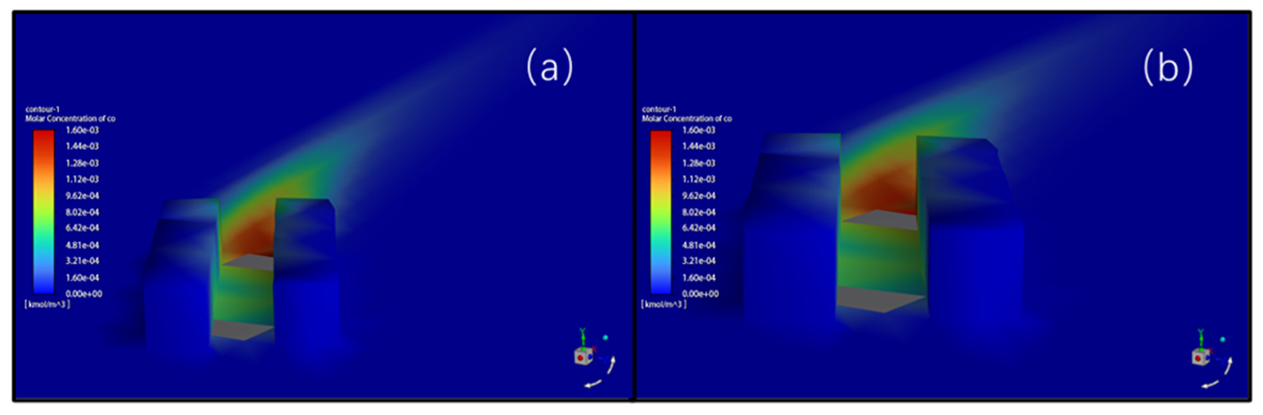 Exhaust Emission Intensity in Different Traffic Conditions: Using the equivalent pollution conversion model and current exhaust emission data, the line-source exhaust emission intensity was calculated for two traffic conditions: free-flowing and congested. The emission intensities were 1.31 kg/(min·km) and 3.08 kg/(min·km), respectively. By altering factors such as wind speed and canyon model parameters, the simulations demonstrated that street canyon morphology significantly affects exhaust pollutant diffusion patterns. Wide and short street canyon models facilitated faster diffusion, while high wind speeds increased the diffusion rate without altering the pollutant diffusion path, thereby reducing exhaust pollutant concentrations. The wind direction angle also influenced the pollutant diffusion path, with wind directions closer to the street canyon axis being more conducive to pollutant dispersion.