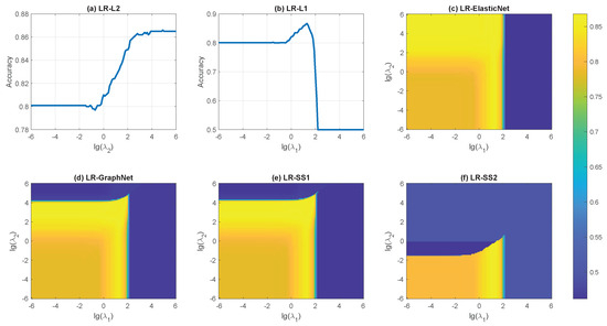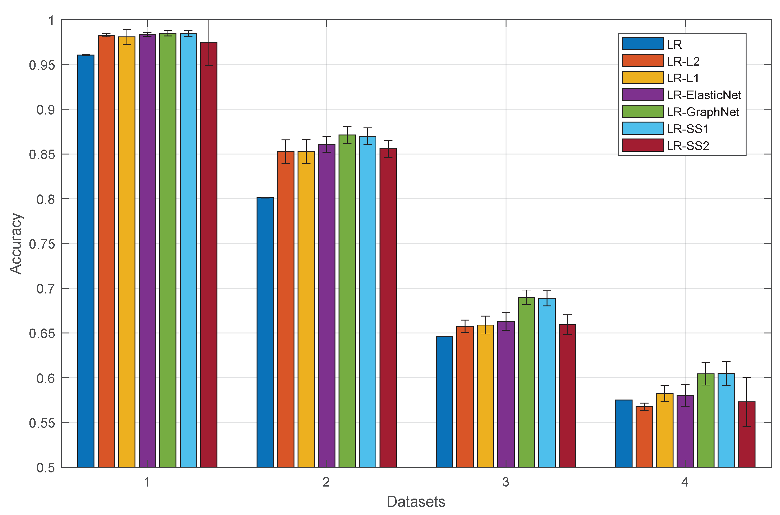 When and , LR-SS degenerates into standard logistic regression [1], denoted as LR. When , and , LR-SS degenerates into logistic regression with L2-norm regularization [1], denoted as LR-L2. When and , LR-SS degenerates into logistic regression with L1-norm regularization, which is the standard sparse logistic regression [9,10], denoted as LR-L1. When , and , LR-SS degenerates into logistic regression with ElasticNet regularization, denoted as LR-ElasticNet [9]. When , , and , LR-SS degenerates into logistic regression with GraphNet regularization, denoted as LR-GraphNet [19]. When , and , the first form of LR-SS is obtained, denoted as LR-SS1. When , and , the second form of LR-SS is obtained, denoted as LR-SS2.
