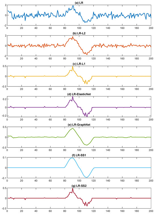 Replacing L2-norm in Equation (15) with L1-norm yields the total variation (TV) regularization, i.e., [40]. Combining TV regularization with lasso regularization generates the fussed lasso (FL) regularization, i.e., [41], where and control sparsity and smoothness, respectively. The sparse regularization promotes sparsity by shrinking weights to zero, while the TV regularization encourages adjacent weights to be similar, producing piece-wise constant solutions [18,22,42]. While these alternative formulations are noteworthy, our primary focus remains on analyzing the smooth effects of various symmetric smooth matrices. Therefore, discussing these alternative formulations is beyond the scope of this study.