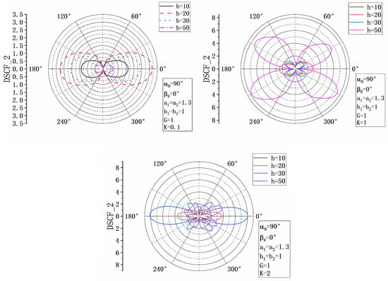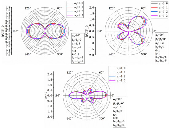 Figure 8 shows the DSCF influence curve of hole No. 1 when the incident wave numbers are 0.1, 1, and 2 with the change in parameters. At this time, the deflection angle of the incident wave is ; the deflection angle of the two holes is . The maximum value of the dynamic stress concentration coefficient of the hole edge appears at about and at the medium-frequency incidence, and the maximum value of the dynamic stress concentration coefficient at the hole edge appears at about and at the low- and high-frequency incidences. At the low-frequency incidence, with the increase in parameters, the dynamic stress concentration coefficient decreases at and . At the middle- and high-frequency incidences, the DSCF pattern changes significantly in the right half, and in the middle frequency, it is mainly concentrated around and , and the DSCF also increases with the increase in parameter a1. At a high frequency, it is mainly concentrated around , and with the increase in parameter , the DSCF also increases.