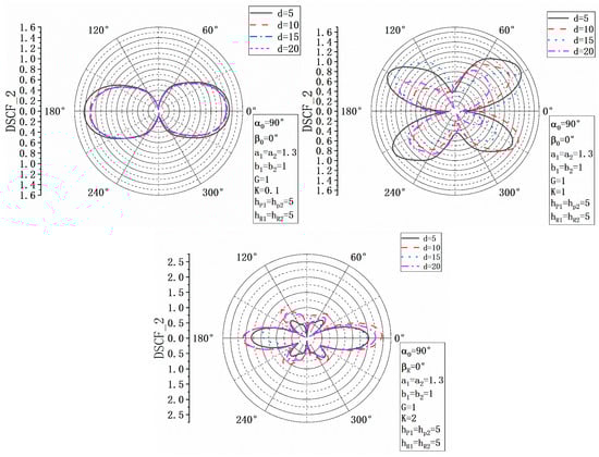 At the low-frequency incidence, the pattern of the DSCF is largest at d = 20 and then decreases, indicating that the DSCF changes regularly, and its magnitude changes at the low-frequency incidence.