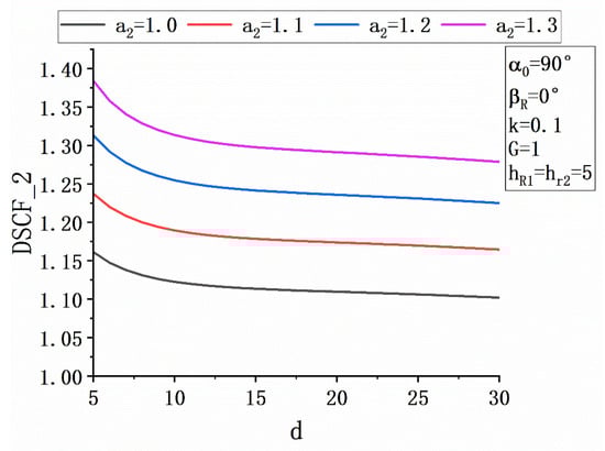 In Figure 9, we can observe that the DSCF curve is most stable at low frequencies. In order to further determine the effect of the gradual increase in parameter d on the dynamic stress at the hole edge, the incidence angle is kept at 10 and the deflection angle is 30. The parameter is increased from 5 to 30, as shown in Figure 10. With the continuous increase in parameter d, the dynamic stress concentration coefficient of the hole edge decreases continuously and the decreasing trend after d = 10 does not clearly change; that is, the rate of decrease is slow. As we have come to the same conclusion, the effect of the distance between the two holes on the DSCF tends to be stable at low frequencies.