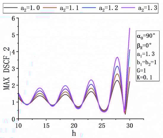 In order to further determine the variation law at low frequency, the MAX DSCF at the hole edge was determined. Let the parameter . As shown in Figure 12, the MAX DSCF exhibits a wave shape at the low-frequency incidence, which is consistent with the conclusions we obtained. As shown in the figure, the maximum dynamic stress concentration coefficient of the hole edge fluctuates at the low-frequency incidence, and it does not change constantly but fluctuates within a certain range, indicating that the thickness of the band domain has a complex influence on the maximum value of the dynamic stress concentration coefficient and not a simple linear relationship.