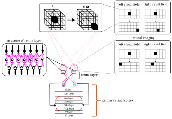 The biological foundation of most current bio-inspired models for motion direction detection originates from motion-direction-selective neurons found in the retina [28,29]. This concept was initially introduced by Hubel and Wiesel in 1959, when they discovered that neurons in the striate cortex of cats exhibit directional selectivity, responding preferentially to motion stimuli in specific directions [30]. However, most of these models focus solely on monocular vision, neglecting the role of stereoscopic vision. This lack of depth perception inherently limits their applicability to two-dimensional images. To address this gap in the current research, this paper introduces a bio-inspired model designed to simulate the motion direction detection function in biological stereoscopic vision, referred to as the Stereoscopic Direction Detection Model (SDDM). The model’s overall architecture is divided into two components, corresponding to the left and right eyes in the formation of binocular disparity [31]. While both components share a similar structure, the horizontal positional difference results in each eye receiving slightly different visual information [32]. The individual monocular model consists of two distinct layers designed to replicate the structural and functional characteristics of the retina and the primary visual cortex. Specifically, we employed computational formulas to model the functions of specific cells and neurons involved in detecting motion direction within 3D images, emulating key components of the biological visual system. These include photoreceptor cells, bipolar cells, horizontal cells, and ganglion cells within the retinal layer, as well as complex cells and binocular-disparity-selective neurons located in the primary visual cortex [33]. Furthermore, we formulated assumptions and constructed simulations based on the biological characteristics of synaptic connections between these cells [34]. The detailed mechanisms underlying these processes will be fully explained in the “Mechanisms and Methods” section of this paper.
