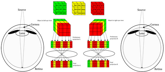 To introduce this mechanism more specifically, consider a simple 3 × 3 × 3 transparent cube as an example. As illustrated in Figure 2, the inner layer is labeled B1-9, the middle layer as M1-9, and the outer layer as F1-9, represented in green, yellow, and red, respectively. For the left eye, when directly viewing this cube, the linear propagation of light reflected from the external object results in a projection of the left, outer, and partially inner sides of the cube onto the retina, forming a matrix. In this case, the outer parts of the object obscure the inner parts, making it difficult to perceive depth in certain regions. Consequently, the projection matrix is arranged as follows: B1, B4, B7 (first column); M1, M4, M7 (second column); F1, F4, F7 (third column, which occludes B2, B5, and B8, sharing the same column); M2, M5, M8 (fourth column); F2, F5, F8 (fifth column, which occludes B3, B6, and B9, also sharing the same column); M3, M6, M9 (sixth column); and F3, F6, F9 (seventh column). This creates the preliminary projection-L as illustrated in Figure 2.