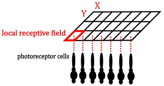 To emulate the function of photoreceptor cells within the framework of the SDDM through computational programming, the initial task is to establish a formal definition of the receptive field associated with each photoreceptor cell. As illustrated in Figure 3, the receptive field corresponding to each photoreceptor in the SDDM is defined as a 1 × 1 pixel. This pixel represents the smallest unit within the retinal receptive field, commonly referred to as the “local receptive field”, and the position of each pixel can be represented by (x, y).