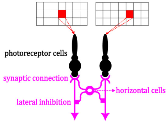 To reappear the aforementioned functions and characteristics within the SDDM framework, the horizontal cell structure has been developed as depicted in Figure 4. From a mathematical perspective, the lateral modulation function of horizontal cells can be conceptualized as a process of calculating the absolute differences in grayscale value between neighboring regions. Specifically, two neighboring horizontal cells receive grayscale values from corresponding photoreceptors at two consecutive time points: t (prior to object movement) and (post-object movement). The absolute difference between these values is computed, and if the result exceeds a set threshold L (set to 0 to reflect the sensitivity of the visual system), it indicates that the post-movement receptive field is not the location of the object’s movement, leading to an inhibitory effect on subsequent neuronal activity. Conversely, if the difference is below the threshold, it suggests that the post-movement receptive field may be the site of the object’s movement, and no inhibitory effect is applied. This functionality can be represented by the following equation: