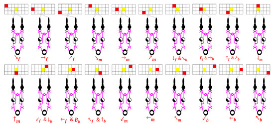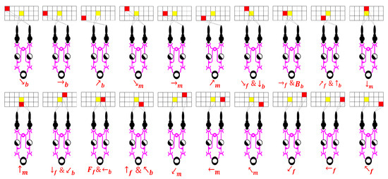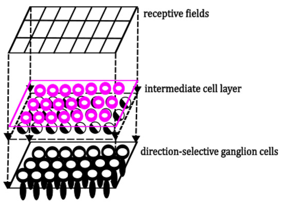 In SDDM, DSGCs are categorized into 26 types, each corresponding to 1 of the 26 fundamental directions of motion in a three-dimensional context (up, up-right, right, down-right, down, down-left, left, up-left; forward, forward-up, forward-up-right, forward-right, forward-down-right, forward-down, forward-down-left, forward-left, forward-up-left; backward, backward-up, backward-up-right, backward-right, backward-down-right, backward-down, backward-down-left, backward-left, backward-up-left). These DSGCs share a fundamentally similar structure, with variations in their preferred directional selectivity, and they exhibit active responses exclusively to motion in a specific direction. DSGCs do not directly acquire information from the retina; instead, they receive preliminarily processed visual inputs through intermediary cells such as bipolar and horizontal cells, which connect to their receptive fields [49]. This structural configuration consequently leads to multiple DSGCs potentially responding to stimuli from the same visual space area, thus sharing the same receptive field. In this paper, a simplified logical model is employed to simulate this complex physiological structure, as shown in Figure 6.