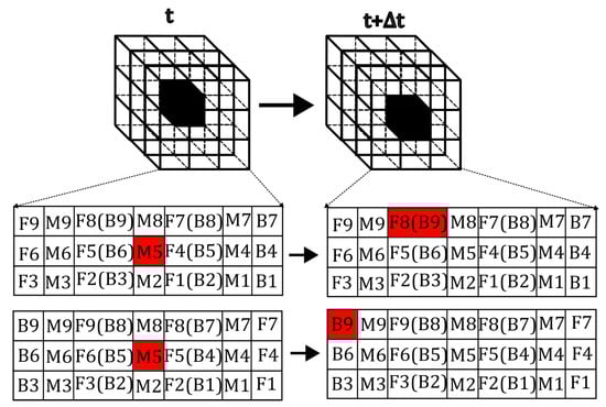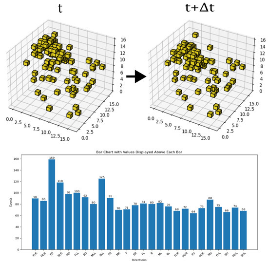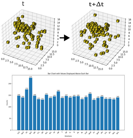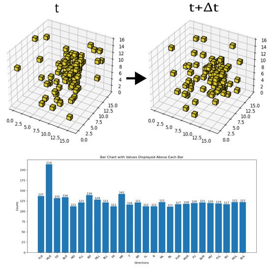 In the background image labeled as time t, a target object is generated at a random location. Each target object consists of multiple contiguous voxels arranged randomly, producing a shape that is fully continuous internally but completely random in form. These objects are categorized into 10 classes based on size, ranging from 1 to 512 voxels, and all objects are assigned a grayscale value of 0. The combination of the three-dimensional background image and the target object constitutes the complete pre-motion frame. Subsequently, each object moves randomly in 1 of the 26 fundamental directions by a span of 1 voxel. The new position after movement is then projected onto the background images labeled as t2, forming the post-motion frames. This method generated a total of 26,000 pairs of such sequential frames as illustrated in Figure 11, thereby constituting Dataset B. In addition, the complexity of the dataset will be continuously increased in subsequent experiments through methods such as adding noise. This will ultimately create a dataset of such sufficient complexity that it becomes difficult to discern with the naked eye, thereby serving as a validation of the model’s robustness.