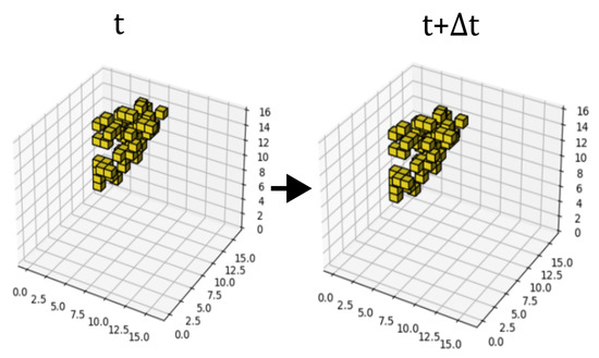 The datasets used in the experiments are relatively simple simulated data. This decision was primarily driven by the nascent stage of replicating biological stereoscopic vision through biologically inspired models. Utilizing simple datasets facilitates a clearer comprehension of the model’s behavior and decision-making pathways during the simulation of biological visual processes, thereby verifying the strong interpretability of the model. Thus, the foundational dataset utilized during the experimental phase is designated as the binary dataset (Dataset B). This dataset comprises 52,000 three-dimensional background images, each comprising 4096 (16 × 16 × 16) uniformly colored voxels with an assigned grayscale value of 255. These background images are grouped into 26,000 pairs. Each pair includes two background frames chronologically labeled as time points t and , representing pre-motion and post-motion frames, respectively.
