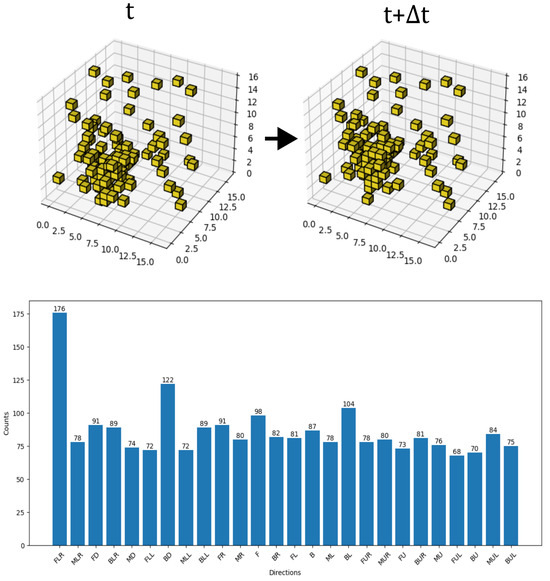 Static background noise, characterized by its temporal constancy and selective transparency, remains unchanged as objects move and does not overlap with objects in their initial state. The static background noise is introduced into experiments for following several critical reasons: firstly, it provides a baseline environment for generalization experiments, enabling the assessment of the model’s fundamental performance. Secondly, it serves as an essential control in studies involving dynamic noise, facilitating the determination of whether the impacts on results are predominantly due to the noise texture itself or its dynamic changes, thus enhancing the reliability of the findings. Thirdly, as static background noise frequently occurs in real-world scenarios, incorporating static background noise validates the model’s adaptability to prevalent operational environments. To add this type of noise, we randomly select a corresponding number of non-overlapping voxels in the pre-motion frame labeled as t in each pair of consecutive motion frames, assigning them a grayscale value of 0. The same voxels are then projected onto the post-motion frame labeled as , creating the static background noise dataset. As illustrated in Figure 12, the direction-selective neuron with a preferred direction of front-lower-rightwards (FLR) exhibits the highest activation count, corresponding to the actual motion direction of the target object. This result confirms that the SDDM can operate effectively even with the addition of static background noise in the dataset.