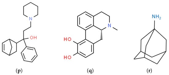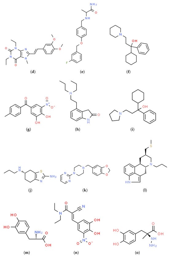 Molecular structures: anti-Parkinson’s drugs. (a) Opicapone; (b) Rivastigmine; (c) Rotigotine; (d) Istradefylline; (e) Safinamide; (f) Trihexyphenidyl; (g) Tolcapone; (h) Ropinirole; (i) Procyclidine; (j) Pramipexole; (k) Piribedil; (l) Pergolide; (m) Levodopa; (n) Entacapone; (o) Carbidopa; (p) Biperiden; (q) Apomorphine; (r) Amantadine.