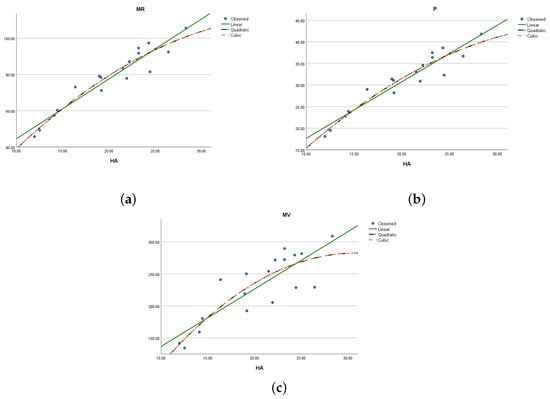 The curvilinear regression equation graphs between (a) MR and HA (b), between P and HA and (c) between MV and HA.