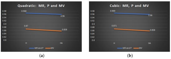 - The correlation coefficient values for the quadratic and cubic regression models are follows (see Figure 8):The correlation coefficients for the H index with MR and the HA index with MR are as follows: and , respectively.The correlation coefficients for the H index with P and the HA index with P are as follows: and , respectively.Also, the correlation coefficients for the H index with MV and the HA index with MV are as follows: and , respectively.