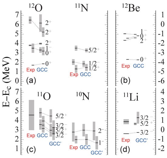 - Michel, N.; Nazarewicz, W.; Płoszajczak, M. Isospin mixing and the continuum coupling in weakly bound nuclei. Phys. Rev. C 2010, 82, 044315. [Google Scholar] [CrossRef]