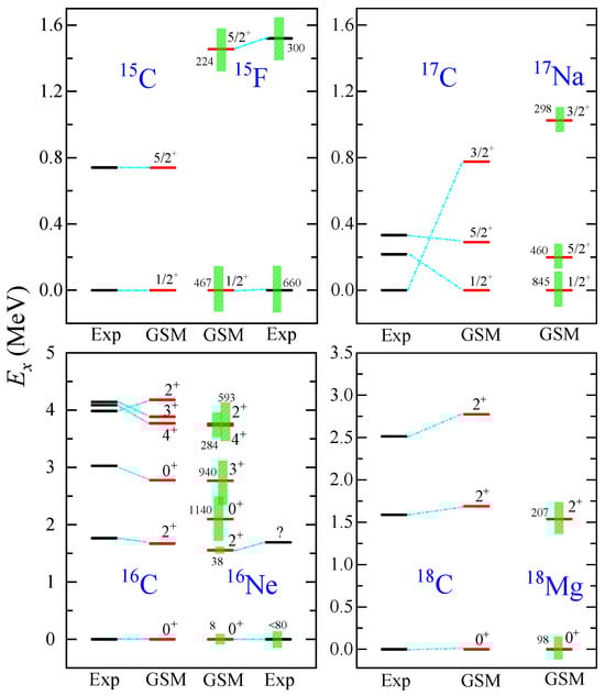 - Geng, Y.F.; Li, J.G.; Ma, Y.Z.; Hu, B.S.; Wu, Q.; Sun, Z.H.; Zhang, S.; Xu, F.R. Excitation spectra of the heaviest carbon isotopes investigated within the CD-Bonn Gamow shell model. Phys. Rev. C 2022, 106, 024304. [Google Scholar] [CrossRef]