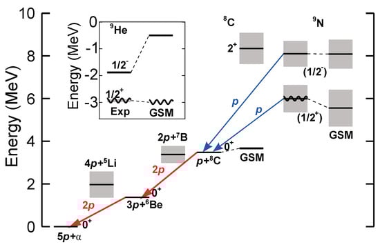 - Michel, N.; Nazarewicz, W.; Płoszajczak, M. Description of the Proton-Decaying 02+ Resonance of the α Particle. Phys. Rev. Lett. 2024, 131, 242502. [Google Scholar] [CrossRef]