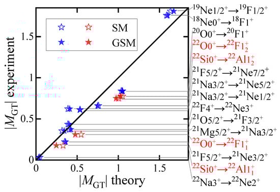 - Lee, J.; Xu, X.X.; Kaneko, K.; Sun, Y.; Lin, C.J.; Sun, L.J.; Liang, P.F.; Li, Z.H.; Li, J.; Wu, H.Y.; et al. Large Isospin Asymmetry in 22Si/22O Mirror Gamow-Teller Transitions Reveals the Halo Structure of 22Al. Phys. Rev. Lett. 2020, 125, 192503. [Google Scholar] [CrossRef]
