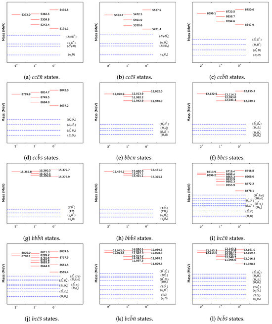 The tetraquarks were distributed in the 11,940.0∼12,052.0 MeV mass range, with the of both the highest and lowest states being . The two states could both decay into and (here, we simply use and to denote and , respectively). The former (latter) channel was dominant for the higher (lower) tetraquark. There were three states that ranged from 11,942.9 to 12,013.9 MeV, with three decay channels: , , and . The respective partial width ratios of the dominant decay channels for the highest, intermediate, and lowest states were
