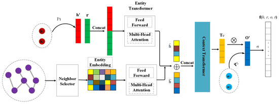 where denotes the ReLU activation function. The trainable parameters are , , , and . In the second Transformer block, the outputs and are integrated, yielding the final output . This process aims to enrich the head entity with relational context derived from its neighboring entities.