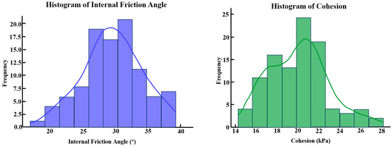 The essence of this research lies in the precise estimation of equivalent sample values using the transformation model formulas listed in Table 3. This process aims to determine the clustering range of histograms and scatter plots and ultimately establish the numerical value of the effective internal friction angle (). Obtaining high-quality original samples was crucial for this procedure. However, owing to the absence of laboratory data during this project, multiple in situ datasets were employed to construct original samples through empirical relationships. The use of empirical methods to estimate original parameters introduces a certain level of uncertainty and errors.