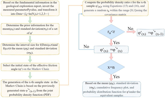 (4) Choose the initial state of the effective friction angle () on the Markov chain. Determine the mean () and standard deviation () of prior knowledge based on Equations (9) and (10). Use the Metropolis–Hastings sampling method to generate a large number of samples for the effective friction angle () according to Equations (5) and (8).
