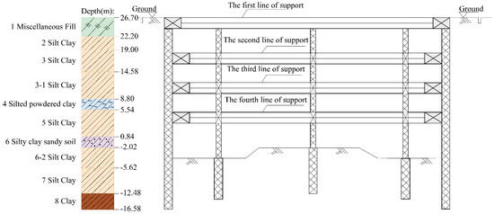 The experimental data used in this study were derived from the geotechnical investigation report of the Wuhan Xunsi River project. The sampled soil layer consisted of silty clay at depths of 10.8–18.8 m below the surface, with a thickness of 8 m. The investigation methods included drilling and sampling, laboratory geotechnical tests, and in situ field tests, which provided the relevant geotechnical parameters such as natural water content, density, cohesion, and internal friction angle.