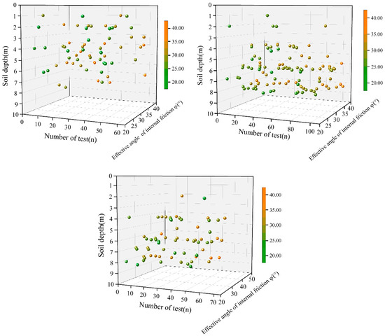 In assessing soil stability, the effective internal friction angle () has consistently been a crucial parameter [6]. However, in practical engineering, it often requires a substantial volume of data to better represent the value of for a specific measurement point or area. In other words, the value of can be significantly influenced by the sample volume. In situations where data acquisition is relatively limited, it can be challenging to generate meaningful statistical data based solely on field survey data. Therefore, the introduction of probabilistic distribution methods [7,8] to determine the effective internal friction angle () of the soil is a critical problem in need of resolution.
