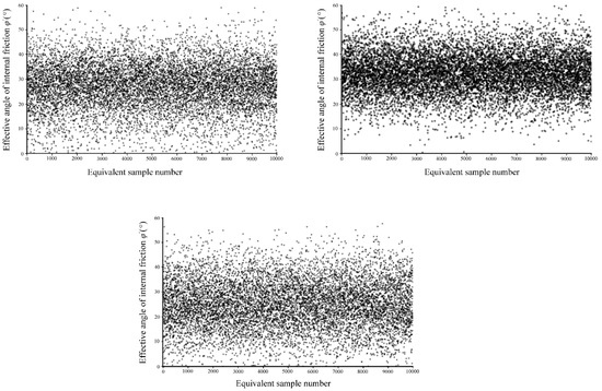 The above three conversion models all used the MCMC method to obtain 10,000 sets of equivalent samples for the effective internal friction angle (). Observing the scatter plots (Figure 5) and histograms (Figure 6) of the equivalent samples for the three models, it is evident that after 63 inversions, Equation (12) produces all values, and through sampling, a large number of equivalent samples can be obtained. Although the average values are close, there is considerable dispersion under different empirical relationships. It may be beneficial to consider merging the data from the three conversion models to further enhance the reliability of their formulas. Consequently, it can be inferred that with an increase in the number of equivalent samples, a more intuitive determination of the range of the effective internal friction angle () can be achieved. The specific results are shown in Table 4, indicating that under these three models, there is some error between the actual values and equivalent sample values. However, the error is not significant. To obtain a more accurate model, it may be beneficial to consider a method that combines the three conversion formulas to obtain a better parameter analysis.