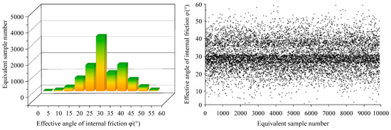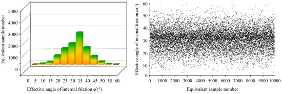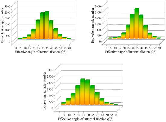 Based on the plasticity index data, on-site static cone penetration test data, and standard penetration test data, combined with Equations (9), (11), (14)–(16), and prior knowledge, the effective internal friction angle () values could be determined. Using the MCMC method, 10,000 sets of equivalent samples for the effective internal friction angle () could be obtained, as shown in Figure 5.