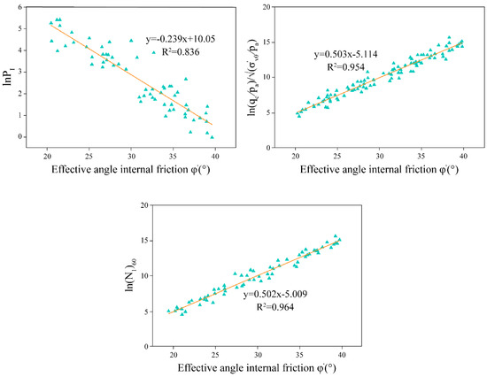 The effective internal friction angle of clay layers under drained conditions can be obtained experimentally. However, in some regions with harsh conditions, it is impractical to conduct on-site tests, making direct testing of soil layers challenging. Consequently, indoor experiments are employed to supplement the limitations of on-site tests. The purpose of these experiments is to obtain shear strength parameters [25]. However, the data on the internal friction angle obtained from indoor experiments often lacks sufficiency, making it challenging to derive statistically significant characteristic values. Therefore, in some small- to medium-sized engineering projects, regression equations or calculations are frequently used to estimate .