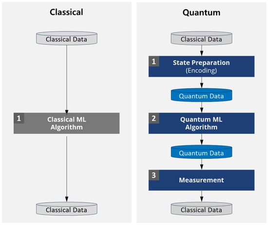 The core of QML lies in converting classical data into quantum states for processing. By utilizing quantum states, QML can learn patterns and make predictions more efficiently. As shown in Figure 1, QML encodes the data into quantum states to take advantage of quantum properties such as parallel computation and entanglement to enhance performance, while conventional machine learning processes data directly through algorithms. Moreover, quantum gates can accelerate matrix operations and reduce computational complexity [23,24]. Therefore, QML requires an additional initial step of quantizing the data, which is part of the state preparation process needed for analyzing data through quantum circuits. Then, QML produces quantum data as output, which will be converted back into classical data.