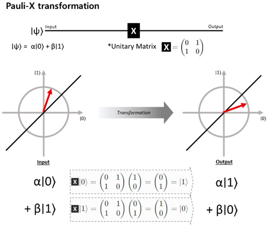 To utilize the benefits of quantum computation in QML, classical data must first be encoded into quantum states. Then, quantum circuits composed of quantum gates manipulate and transform the quantum states, exploiting quantum phenomena such as superposition and entanglement. Figure 2 illustrates an example of transforming data through a quantum gate. Quantum gates like Hadamard, CNOT, and Pauli gates are fundamental components for manipulating qubits in quantum computing. These gates apply unitary transformations, preserving quantum information by keeping the total probability constant. A single qubit state can be represented as a quantum state or vector, where coefficients α and β are probability amplitudes representing the likelihood of measuring the qubit in either the ∣0⟩ or ∣1⟩ state. For instance, a Pauli X gate rotates the qubit 180 degrees about the x-axis on the Bloch sphere. By combining such transformations, more complex probability distributions can be represented, ultimately enabling more efficient problem-solving in quantum algorithms.