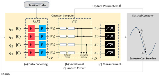 Quantum Support Vector Machines (QSVMs) and Variational Quantum Classifiers (VQCs) are among the most widely used supervised learning-based quantum machine learning algorithms [42]. The reason for selecting the Variational Quantum Classifier (VQC) algorithm is as follows. First, by utilizing Parameterized Quantum Circuits, it can be specifically designed for particular problems [41], making it a flexible algorithm. This type of algorithm possesses a flexible structure that allows for the adjustment of parameters determined through learning [43]. Mathematically, the Variational Quantum Classifier (VQC) can be represented as . In this framework, the input data is utilized to prepare the initial state, and measurements along the Z-axis of the m qubits are performed to optimize the parameters θ during the training process. These measurement values are denoted as , representing the expectation value of the Z-axis for the k-th qubit. Consequently, the vector of expectation values serves as the foundation for the model’s predictions.