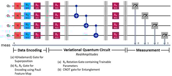 Among various quantum circuits, four learnable circuits provided by the Qiskit library include PauliTwoDesign, RealAmplitudes, EfficientSU2, and TwoLocal. For this study, we selected RealAmplitudes, as it is primarily used for developing classification circuits and is more efficient than the others [47]. To facilitate data encoding, we employ the Pauli Feature Map, enabling the input data to be operable on the quantum circuit. Operations are performed through qubit rotations using Pauli operators (e.g., , operators). An example of a circuit designed using RealAmplitudes is shown in Figure 5.